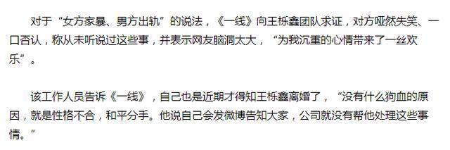 对此有媒体向王栎鑫工作人员求证,对方对此比较无语,表示从来没听说过这些事情,网友脑洞太大,甚至在这样的情绪下还让自己有一丝欢乐,两个人离婚没什么狗血原因,就是性格不合。