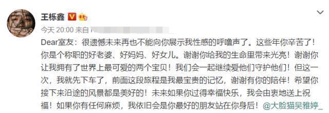 14日王栎鑫与吴雅婷在社交平台上双双发文宣布了离婚的消息,王栎鑫的文字比较长,夸赞吴雅婷是好老婆、好妈妈、好女儿,给自己的生命带来了光亮,也让自己拥有了世界上最可爱的两个宝贝,两个人会一起继续爱他们守护他们,但是这次自己先下车了,双方是最好的朋友。