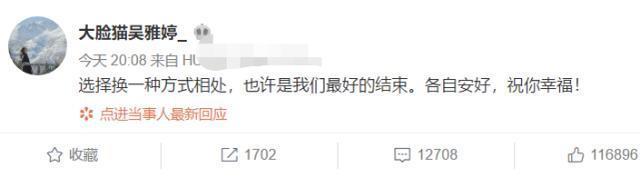 反观吴雅婷的回应就比较冷淡,她写道:“选择换一种方式相处,也许是我们最好的结束,各自安好,祝你幸福”因为以往都是模范夫妻形象示人,突如其来的消息让人无法接受,许多人质疑王栎鑫是不是出轨了,引发了这样的猜测。