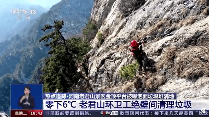 原标题:环卫工零下6度绝壁间捡垃圾,地点还是老君山