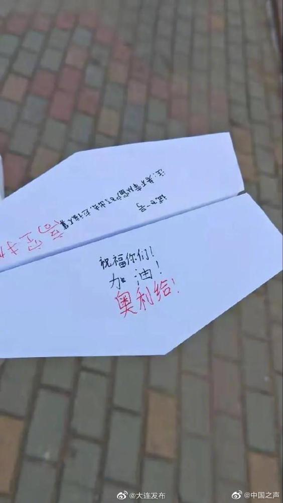 【战疫有情!大连隔离区飞出一只暖心纸飞机】12月17日,辽宁新增2例无症状感染者,格林小镇社区封闭并进行全员检测。12月19日上午,一只纸飞机从大连格林小镇某楼的窗口飞出,恰巧落在防疫执勤工作人员的身边。他拾起这个“高空抛物”,上面的话让人泪目:“祝福你们!加油!奥利给!”小小纸飞机,传递温暖和力量!