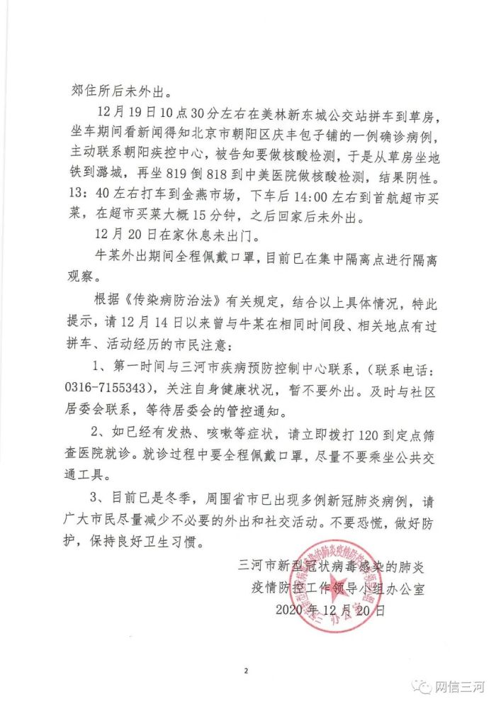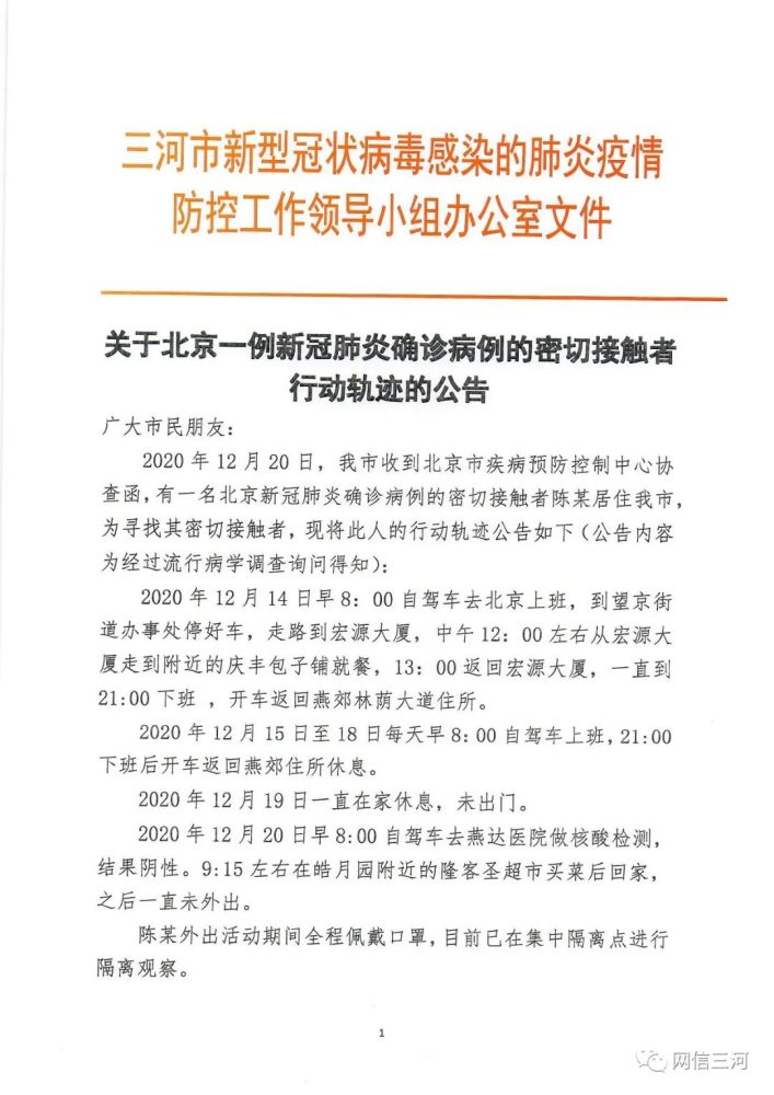 中新经纬客户端12月21日电 据“网信三河”21日消息,河北省三河市新型冠状病毒感染的肺炎疫情防控工作领导小组办公室公布北京两例新冠肺炎确诊病例的密切接触者行动轨迹。