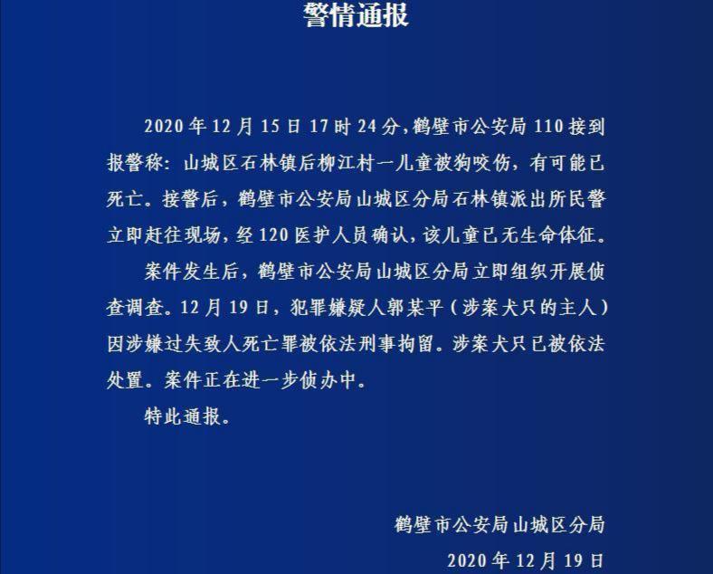 2020年12月15日,河南鹤壁发生了一起狗子咬伤人事件,警方接到报案以后,迅速对现场进行了排查,狗子咬伤的女童已经没有了生命特征。