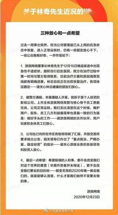 游族网络官方公众号“YOOZOO”发布《关于林奇先生近况的说明:三个放心和一点希望》,表示过去一周事出突然,但当公司管理层已从上周的应急状态中恢复,进入正常运转时,仍有一些朋友放心不下,一些公众抱有好奇,一并作答。