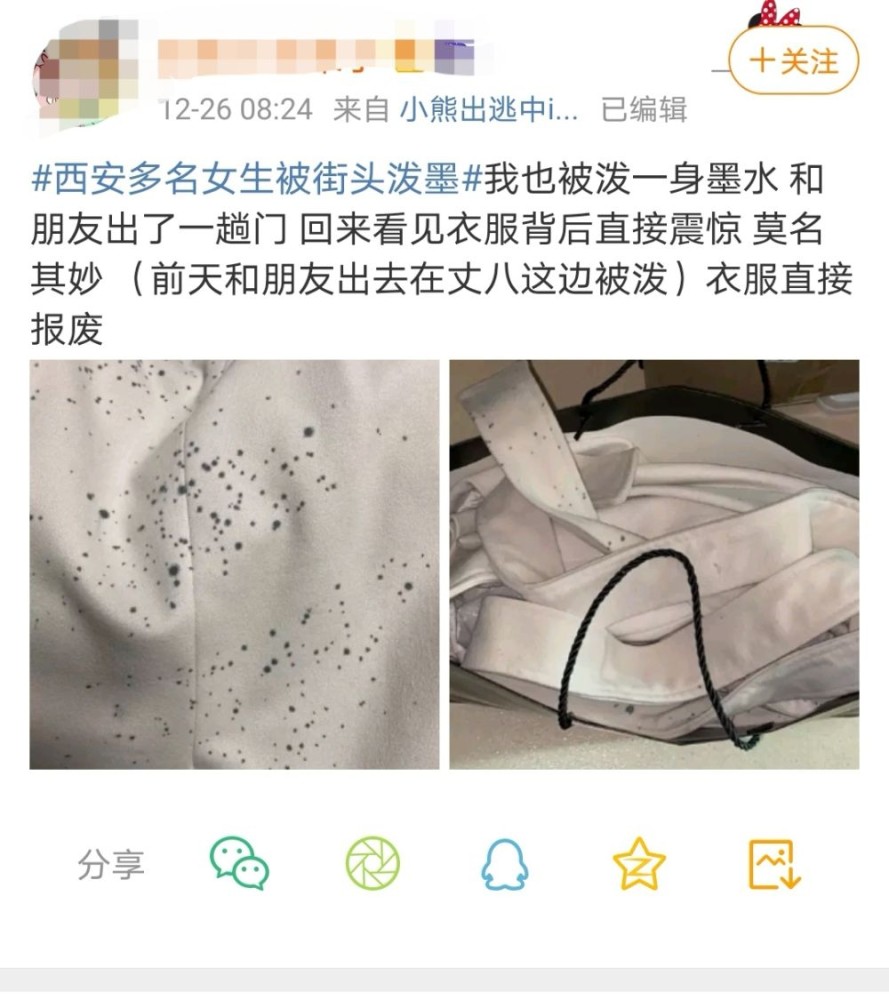 西安多名女子称穿浅色衣服行走时被“泼墨”