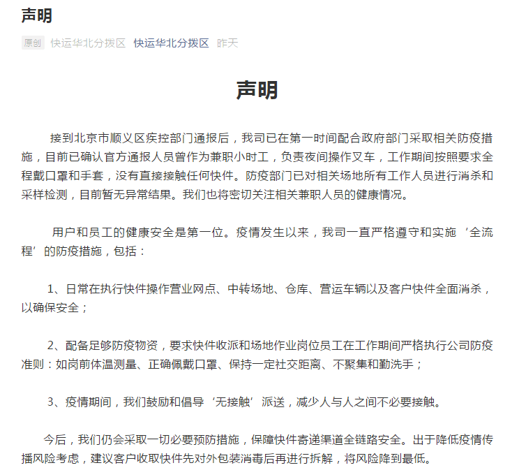 “目前已确认官方通报人员曾作为兼职小时工,负责夜间操作叉车,工作期间按照要求全程戴口罩和手套,没有直接接触任何快件。”对此,顺丰快运华北分拨区12月27日发布声明称,已在第一时间配合政府部门采取相关防疫措施,防疫部门已对相关场地所有工作人员进行消杀和采样检测,目前暂无异常结果。将密切关注相关兼职人员的健康情况。