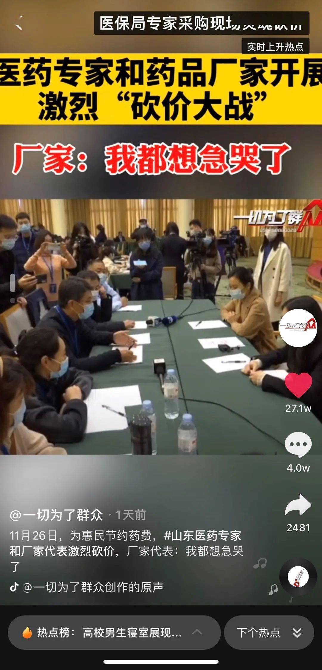 有媒体11月26日发布了一条题为“医药专家和药品厂家开展激烈‘砍价大战’”的视频新闻,截止11月27日14:30,该视频获赞超过27万。
