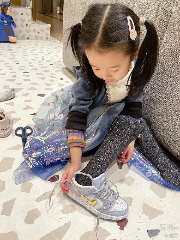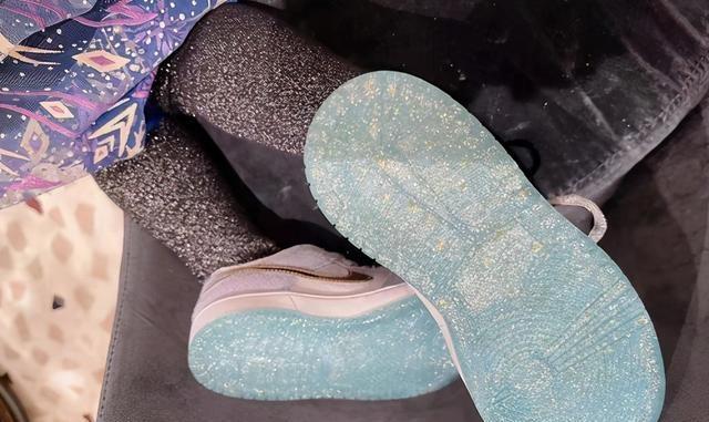 比起安安的正脸,她脚上的鞋子更加吸睛,某名牌冰雪奇缘系列,蓝色外观精致俏皮。