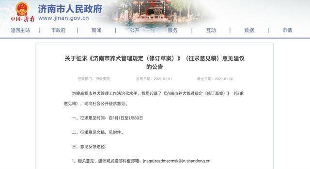山东济南市拟对文明养犬做出进一步规范。2021年1月1日,济南市政府官网发布市公安局关于征求《济南市养犬管理规定(修订草案)》(征求意见稿)意见建议的公告。根据征求意见稿,任何单位和个人不得遗弃所养犬只,违者将被处以2000元罚款。携犬出户时,携犬人应当随身携带清除犬粪的物品,及时清除犬粪,违者将被责令清除,并对处以500元罚款。