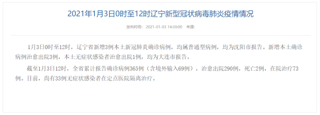 1月3日0时至12时,辽宁省新增3例本土新冠肺炎确诊病例,均属普通型病例,均为沈阳市报告。新增本土确诊病例治愈出院3例,本土无症状感染者治愈出院1例,均为大连市报告。