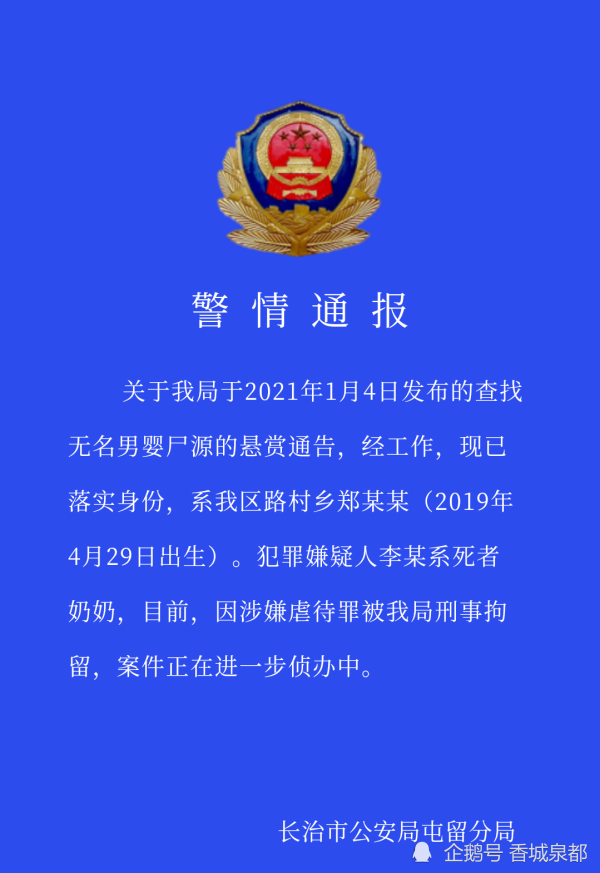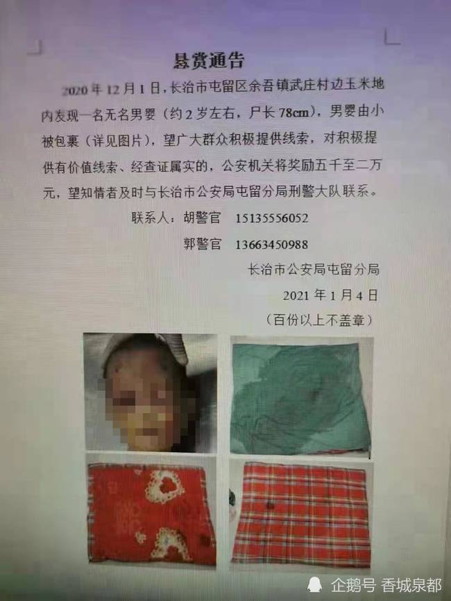 1月4日,长治市公安局屯留分局发布悬赏通告称,2020年12月1日,长治市屯留区余吾镇武庄村边玉米地内发现一名死亡的无名男婴(约2岁左右,尸长78cm),男婴由小被包裹。通告显示了包裹男婴的物品,一条红白相间的格子布、一条青绿色的方块布以及一条印有心形的红布。通告称,望广大群众积极提供线索,对积极提供有价值线索、经查证属实的,公安机关将奖励五千至二万元,望知情者及时与长治市公安局屯留分局刑警大队联系。