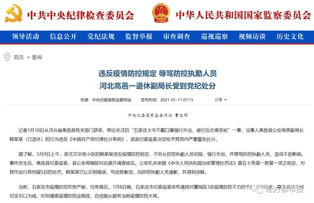 今天(11日)上午7时15分,中央纪委国家监委网站发布《违反疫情防控规定 辱骂防控执勤人员 河北高邑一退休副局长受到党纪处分》一文。