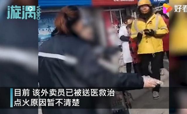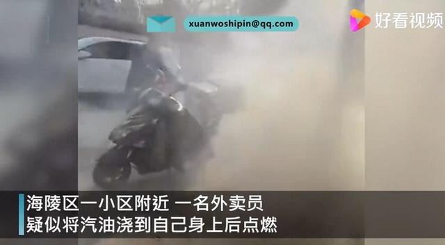 月11日,江苏泰州。海陵区一小区附近,一名外卖员疑将汽油浇到自己身上后点燃。附近商户发现情况后,立即上前灭火施救。火灭后外卖员自行爬起拒绝前往医院救治,目前已被商户救下送医。