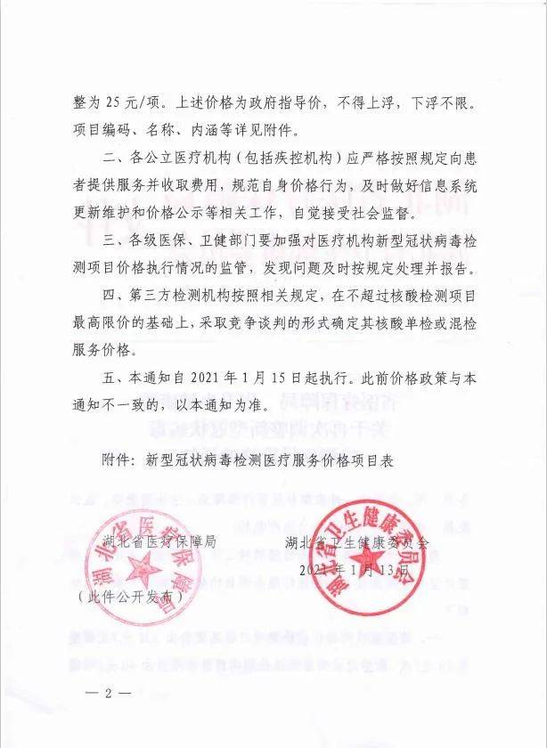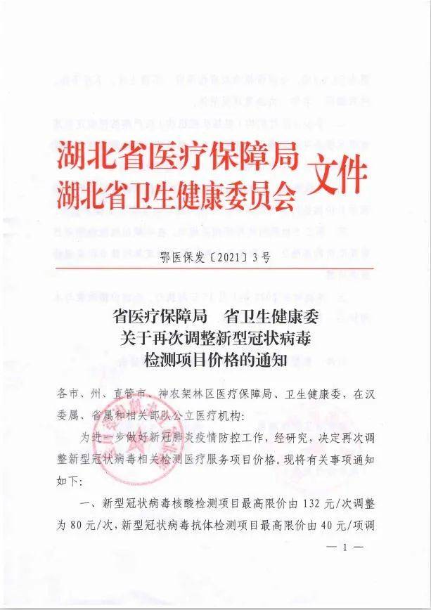 刚刚!湖北核酸检测费用再次降价 刚刚! 湖北省医保局、省卫健委联合印发 《关于再次调整新型冠状病毒检测项目价格的通知》 项目价格由每人每次核酸检测 由132元调整至80元 每人每项抗体检测 由40元调整至25元 于1月15日在全省执行