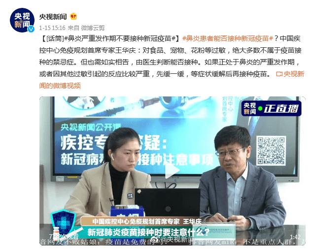 原标题:专家:鼻炎严重发作期不要接种新冠疫苗