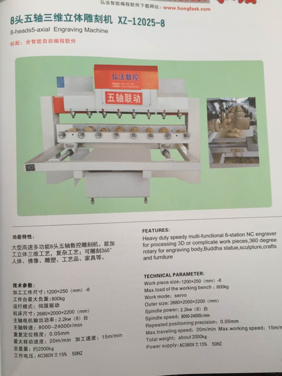 本公司生产的实木家具雕刻机专针对家具厂、工艺品行业开发的一款实木家具雕刻机,可批量生产立体三维工艺、家具立体脚、圆柱体、人体、佛像、观音、雕塑、工艺品、动物生肖等等三维物品,本机配有八个雕刻头,可一次生产八件产品,相当于目前市场上同类产品的几倍效率,人工雕刻的五倍产量,可在三个月收回设备成本。