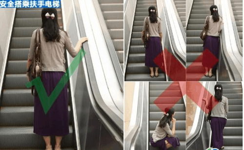 乘用扶梯时,头、手、身体等部位不能超出扶手带,以防挤伤、碰伤。穿裙子的女士上下扶梯的时候,注意不要让裙摆挂在扶梯上。 如遇意外,可按下电扶梯的紧急停机按钮,如非必要,严禁滥用紧急停机按钮,以免令其他乘客跌倒受伤。