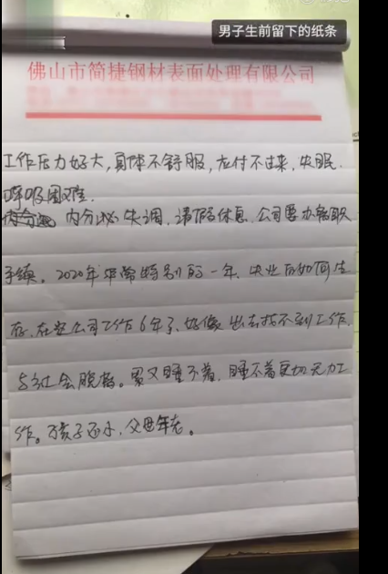 从死者所留下的文字,其中词者有提到工作压力很大、身体不舒服、应付不过来、失眠、呼吸困难,内分泌失调、请假休息就要办理离职手续。并且还提到在这个工厂内工作了6年,担心出去后找不到工作,与社会脱离,家中还有小孩子和年老的父母等等。