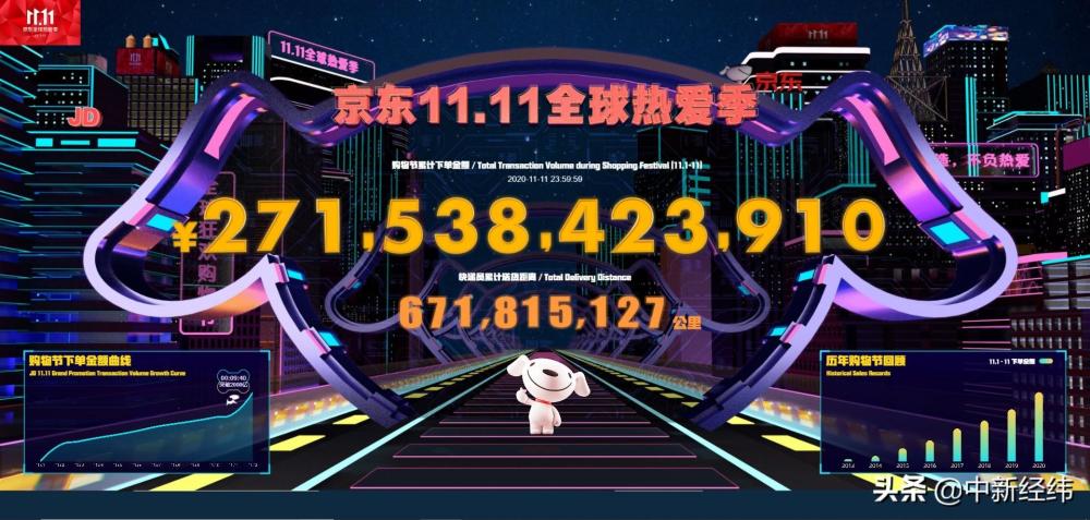 2020年,京东11.11全球热爱季(2020年11月1日至2020年11月11日)累计下单金额超2715亿元。