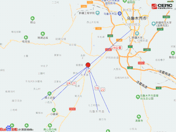 周边县城:震中距乌鲁木齐县20公里、距沙依巴克区25公里、距头屯河区26公里、距天山区27公里、距新市区27公里,距乌鲁木齐市26公里。