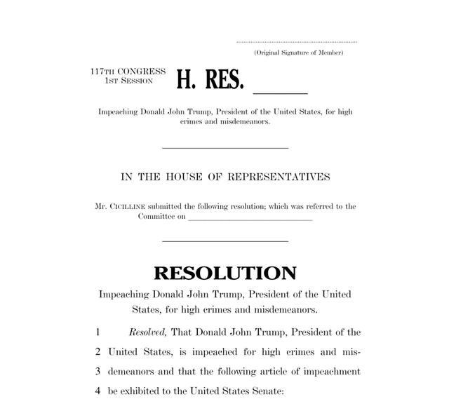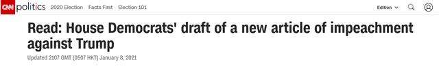 美国有线电视新闻网(CNN)刚刚消息称,国会众议院民主党人已撰写了一份针对特朗普的新的弹劾决议草案。草案其中写道,“唐纳德·约翰·特朗普故意煽动针对美国政府的暴力行为。”