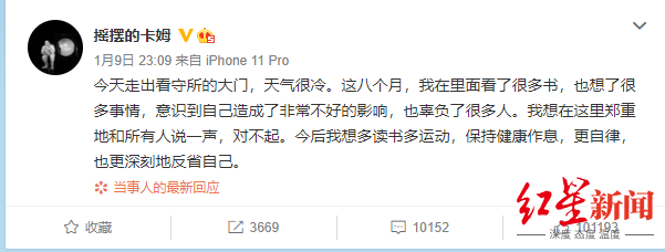 @摇摆的卡姆 9日晚发布微博致歉,称意识到自己造成了非常不好的影响,也辜负了很多人,郑重地和所有人说一声,对不起。