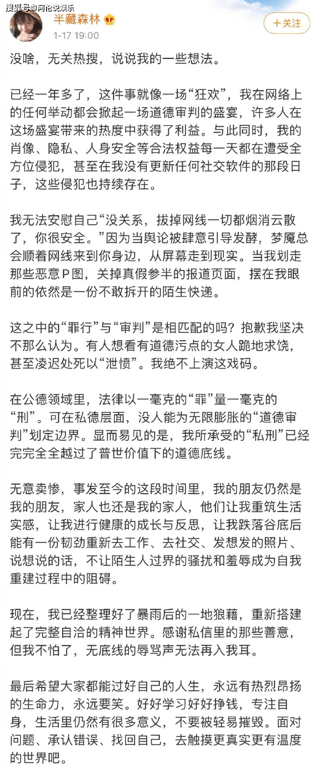 1.17日半藏森林在广告风波后发长文,称她在网络上的任何举动都会掀起一场道德审判的盛宴,与此同时,自己的肖像、隐私、人身安全等合法权益都在遭受全方位侵犯,自己所承受的“私刑”已经完完全全越过了普世价值下的道德底线。“有人想看有道德污点的女人跪地求饶,甚至凌迟处死以'泄愤'。我绝不上演这戏码。”“我已经整理好了暴雨后的一地狼藉,重新搭建起了完整自洽的精神世界。其的意思是自己已经从过去的那些错误里走了出来准备迎接新的世界,最后希望大众可以过好自己想过的生活