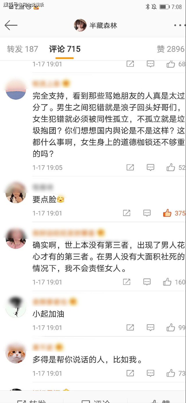 原本以为这条微博底下必定都是谩骂声,没想到的是居然还有人站在她一边为她说话的,就有人直言不讳地声称多的是帮你说话的比如自己,还有人觉得一个女的当小三并不是女的问题,而是那个男人的,在这条评论区底下看到一条这样的评价:“世界本来没有第三者,男人花心所以才有了第三者”、“作为一个女孩子心疼你,希望你重新振作起来”在我看来男人固然有错,而这个半藏森林是没有问题的吗?