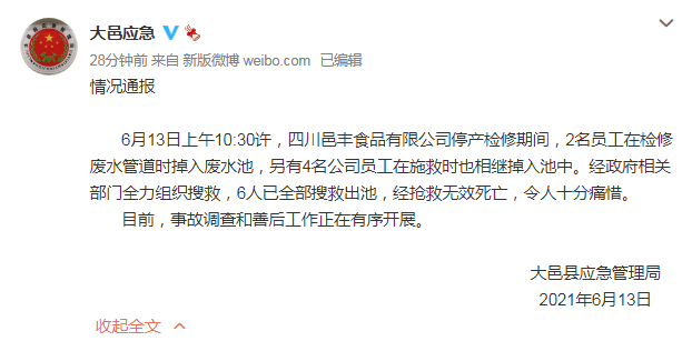 据大邑县应急管理局通报,6月13日上午10:30许,四川邑丰食品有限公司停产检修期间,2名员工在检修废水管道时掉入废水池,另有4名公司员工在施救时也相继掉入池中。经政府相关部门全力组织搜救,6人已全部搜救出池,经抢救无效死亡,令人十分痛惜。